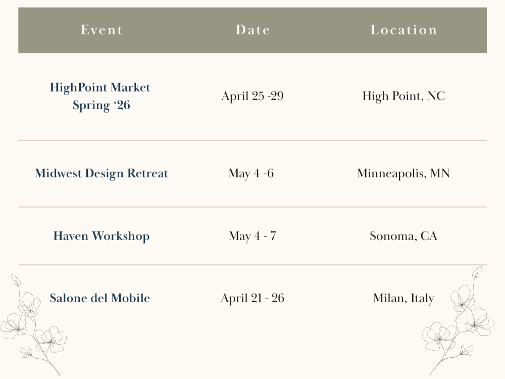 Spring 2026 is shaping up to be a big season for the design community β and we're here for all of it. Whether you make it to one event or all three, showing up for your business (and your people) is always worth the investment.